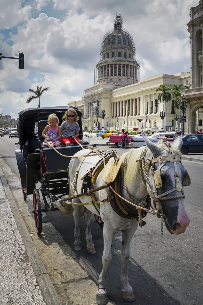 The first day in Habana was a bit of trial. We still weren't 100% sure of our surroundings and it wasn't long before the day got a little too hot to be walking around, especially with the kids. We did however start to get a feel for the place and after a rest from the midday heat we headed out again in the afternoon to explore. On the way we found another little plaza (above), horses, old buildings, cars, weird motorized yellow egg cars, and lots of people on the streets.