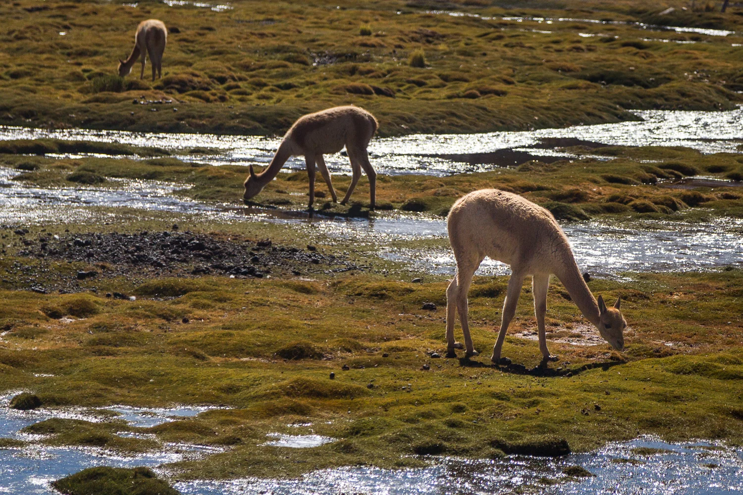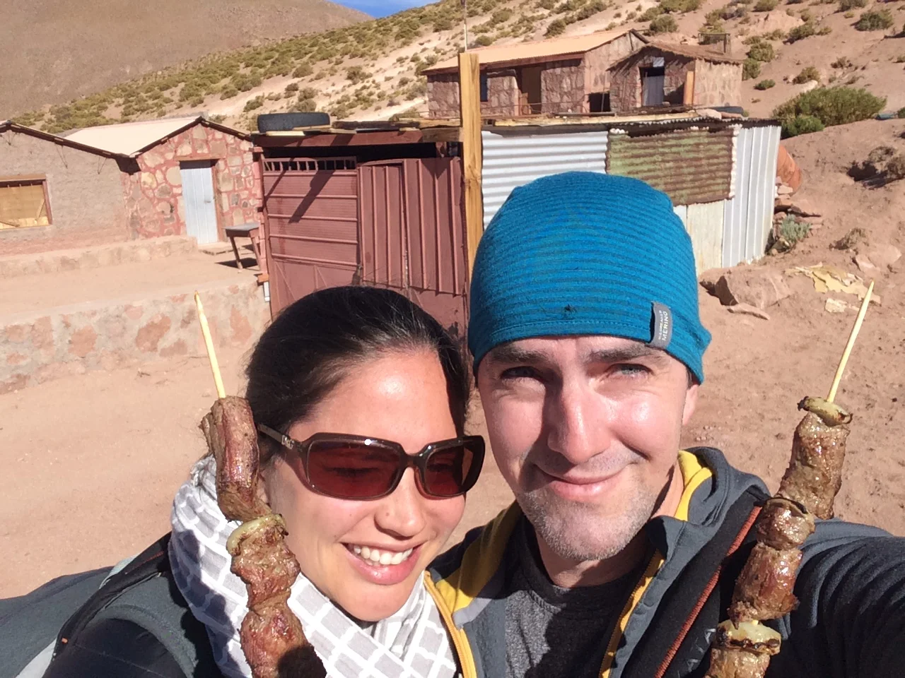 After a little breakfast watching the geysers, we slowly headed back to San Pedro. Along the way we stopped at high altitude lagoons, checked out roadside Vicuña and Llamas, and stopped at a little historic town where they were making Llama Kebabs. Of course we had to try it. And they were grand.